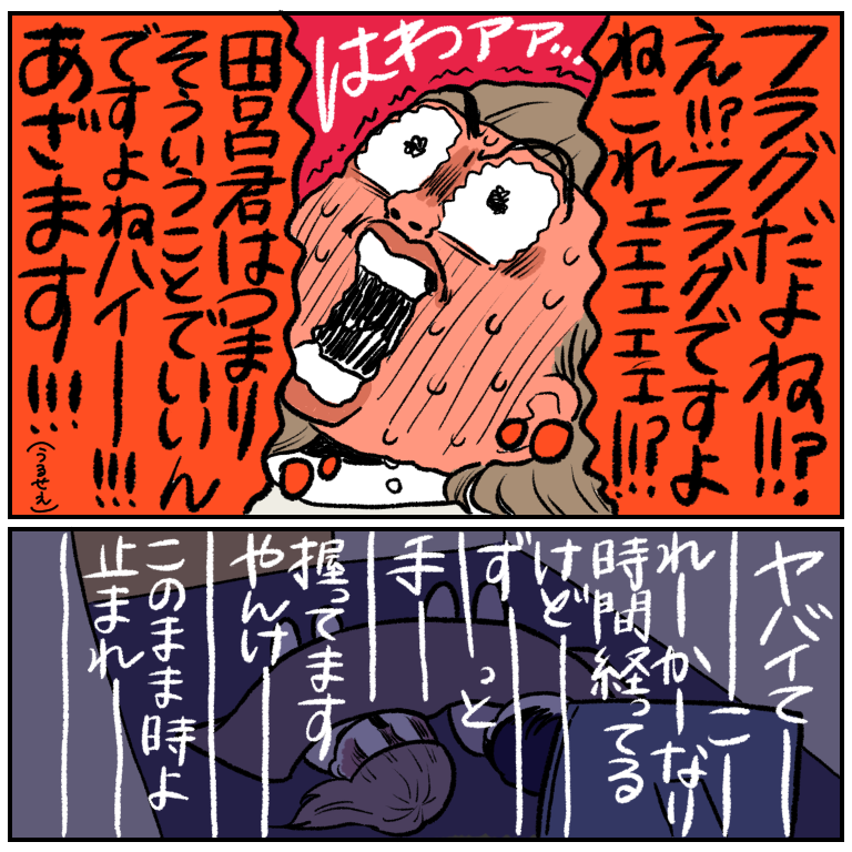 そして手を握るまで数分間の出来事かと思いきや何時間も経ってて笑いました!