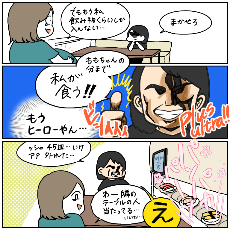 オタクヒーロー、その果てに(ヒロアカ語り有り) 最初こそ食べたいもの食べてたけど、途中からいかにびっくらポンをより多く回せるかだけを考えてた52皿はなかなか頑張ったと思うひさびさに「満腹すぎる」感覚を味わって懐かしい気持ちになった…ちなみに成果はシール2つ(切島くんと上鳴くん)で、さやまちゃんはパンパンの ... 2021/07/15 最初こそ食べたいもの食べてたけど、途中からいかにびっくらポンをより多く回せるかだけを考えてた52皿はなかなか頑張ったと思うひさびさに「満腹すぎる」感覚を味わって懐かしい気持ちになった…ちなみに成果はシール2つ(切島くんと上鳴くん)で、さやまちゃんはパンパンのお腹を抱えながらメルカリで他のヒーローたちのシールを次々購入していましたとさ…〜完〜(さやまちゃん頑張ってくれてありがとう!君は僕のヒーローだ!!)〜〜〜以下、ブログ限定のヒロアカ語り。アニメ全話のネタバレ有!!(イラストも有)〜〜〜や〜ーー、見事にハマりました。ヒロアカ。見る前から、絵柄とか雰囲気で好きになりそうだなって予感はしてたんですが、予想の40000倍ハマりました。もうさ、全キャラ良すぎなんだよ…ずるいよあんなの…まずデクくんよ!!こんなに推せる主人公います!?いません!!(反語)ジャンプの主人公って良くも悪くも「考えずに突っ走る」系多いじゃないですか。理屈より感覚!やる気!元気!根性!!みたいな。その中でデクくんは異彩を放ってますね。ちゃんと考えて、理性的に動く。だから、めちゃくちゃ共感できる。これが私にとってはすごく新鮮な感覚でした。少年漫画の主人公に共感したことなんて今までなかったかも…そしてデクくんを取り巻くA組のクラスメートたちよ…もうさ…みんなさ…いい子…(涙)憧れるヒーロー像、頑張る理由、好きなものも嫌いなものもみんなそれぞれ。だけどみんな、「強くなりたい」。自分の目指すもののために、強くなりたいから、 それぞれ前を向いて頑張ってる。その姿に、想いに、心を動かされっぱなしですわ…みんな好きだけど私の推しは轟くんです。かっこいいし可愛いし かっこいいし可愛いし かっこいいし可愛いから。(語彙崩壊)好きなシーンはたくさんありすぎるんだけど、有名どころはもちろんのこと林間学校でカレーを作るとき、みなちゃんに頼まれて轟くんが左手で火をつけてあげるシーン、あの時の轟くんの優しげな笑みはたまりませんよねェェェッ!!「左は絶対使わない」と言っていた過去を知っているから、こんな穏やかな表情で炎をあつかう轟くんに泣かされますよね……ウゥ…(涙)あと、エリちゃん救出作戦を前に落ち込むデクくんに、「蕎麦、半玉やろうか?」「ねぎいるか?」「わさびいるか?」と声かけてあげる轟くん優しすぎてギュンッッ(心停止つれえ…好きすぎてつれえよ…轟くんに限らず、一番好きなストーリーはエリちゃん奪還→文化祭 のところですね!!エリちゃん奪還(VSオバホ)はトォにかく切島くん、ミリオ、デクくんがカッコ良すぎ!!(細かく語ってるととんでもない文字数になるので割愛します、はぁ好き。声優さんもいいよね!)そして文化祭は、みんなが闘い以外で一生懸命になってる姿を見れたファン泣かせのストーリーでしたね!?!?(同意を求めるかっちゃんのドラム姿、Fコードで躓いたけど頑張ってる常闇くん、指痛いけど耳郎ちゃんのために頑張る上鳴くん、演出考える轟くん…などなど、みんな輝いてて本当に愛おしかった…(やっぱりバンドチームがいちばん好き)耳郎ちゃんのご両親もほんと素敵な方だし、(「響歌、好きにやっていい」で号泣) あんなに恥ずかしがってた耳郎ちゃんが壇上で楽しそ〜にうたう姿に涙腺崩壊したよね…みんなのダンスも可愛いし!!!演出チームも頑張っててすごいし!!!(踊るデクくんほんとクァいい)そして何より!!! エリちゃんの笑顔!!ミリオの涙!!も〜〜日本海できそうなくらい泣きました。嘘ですけどね。普通にエーンって泣きました。(大人がエーンって泣くの相当…というわけで、ヒロアカは笑って泣けて、アツくなれる最高のコンテンツです。たくさん語ってしまいましたが、これからも機会を窺って語るので 、皆さん覚悟しててください。最後にツイッターに載せたイラストを貼り付けて終わります。 (推しキャラ集合!かっちゃんの手が左右逆なのは、誰かの個性によるものと思ってください)(ガールズメンバー。みんなそれぞれ可愛くて好きです。しかし葉隠ちゃんがなぜ雄英に入学できたのか、すごく謎です。)(ファッションイラストを描いてたつもりだったんですが、気づいたらデクとお茶子ちゃんを描いてました。)以上、お付き合いいただきありがとうございました!!!最後にみんなで、せ〜の!プルスウルトラ〜〜〜!!!!こちらのリンクから読者登録ができます↓ブログが公開されたらLINEでお知らせが届きます。ぜひ登録してくださるとうれしいです!