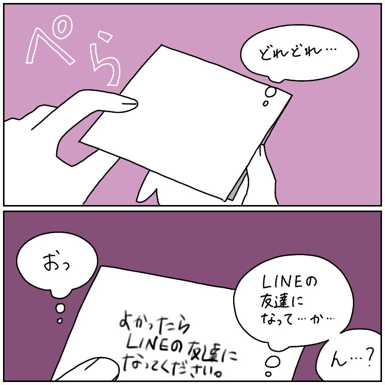 斬新すぎるナンパに遭遇!〜フォロワーさんの未知との遭遇 ★新しすぎるー…!!!!本気で読み取ってほしくて一生懸命書き写したのだとしたら、なんていじらしい男の子(勝手に年下と判断)なのでしょう…!ちなみに作業メンバー(しばたまちゃん、さやまちゃん、笹川めめみちゃん)に「こんなん認識できることあんの?」と聞いてみ ... 2021/07/19 ★新しすぎるー…!!!!本気で読み取ってほしくて一生懸命書き写したのだとしたら、なんていじらしい男の子(勝手に年下と判断)なのでしょう…!ちなみに作業メンバー(しばたまちゃん、さやまちゃん、笹川めめみちゃん)に「こんなん認識できることあんの?」と聞いてみたら、「マジで精密に書き写せたら、読み取れるよ」と言われおったまげました…できるんだ…すっごい…少年よ、練習して、認識できるレベルまで、高みを目指すんだ…!こちらはフォロワーさんからいただいたネタをもとに描いた漫画です。ネタのご提供、ありがとうございました!こちらのリンクから読者登録ができます↓ブログが公開されたらLINEでお知らせが届きます。ぜひ登録してくださるとうれしいです!