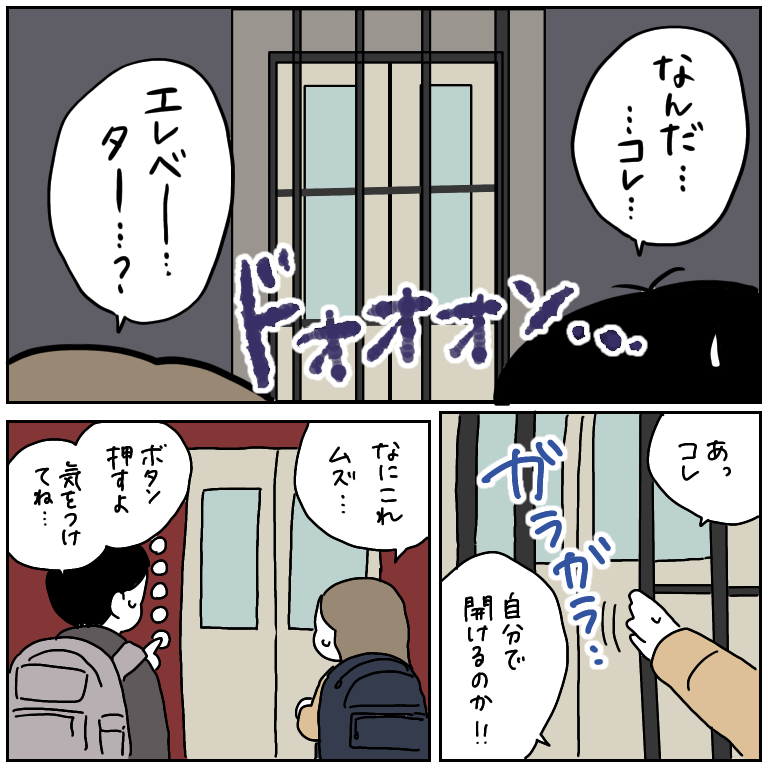自分で門みたいなのを開け閉めしないといけない上に、肝心のエレベーター自体にはドアが付いてないという…おぼろげな記憶で描いたので間違ってるかもしれませんが、そんな感じでした!