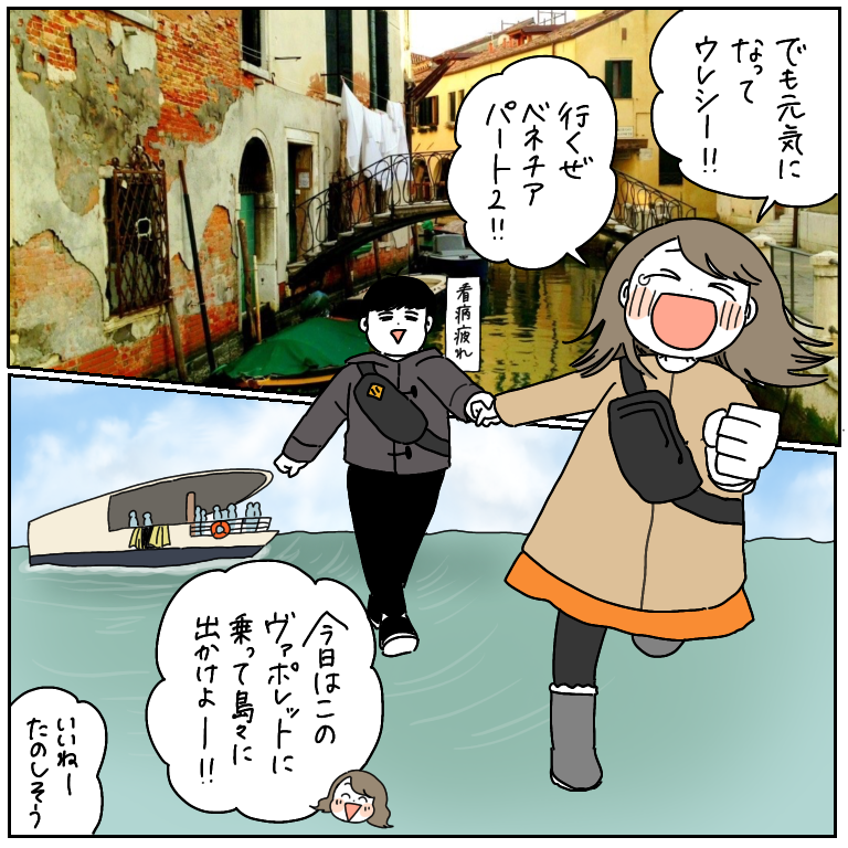 タロスケによる、最上級の看病の果てにー…【ヨーロッパ旅行記27】 ヨーロッパ旅行記、第27話です!前回の話はこちらから↓ 最初から読む方はこちらから↓タロスケは私が寝ている間も定期的に起きては、ちゃんと息してるか、熱上がってないかを確認して濡れタオルを交換してくれていたみたいです…オ…おかあさあああああああああん!!!!! ... 2021/10/01 ヨーロッパ旅行記、第27話です!前回の話はこちらから↓ 最初から読む方はこちらから↓タロスケは私が寝ている間も定期的に起きては、ちゃんと息してるか、熱上がってないかを確認して濡れタオルを交換してくれていたみたいです…オ…おかあさあああああああああん!!!!!!!(違)そして看病疲れでヘロヘロの中、また朝からベネチア観光に付き合ってくれて…本当、どれだけ感謝を伝えたらいいのかわからないよッッ!!!私が逆の立場だったら小言の一言でも言ってしまうかも…タロスケ先生を見習って精進いたしますッ!!!おまけリゾット食べて帰る道サイレントヒルかとおもった続きはこちら こちらのリンクから読者登録ができます↓ブログが公開されたらLINEでお知らせが届きます。ぜひ登録してくださるとうれしいです!