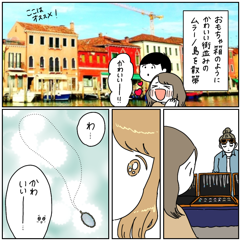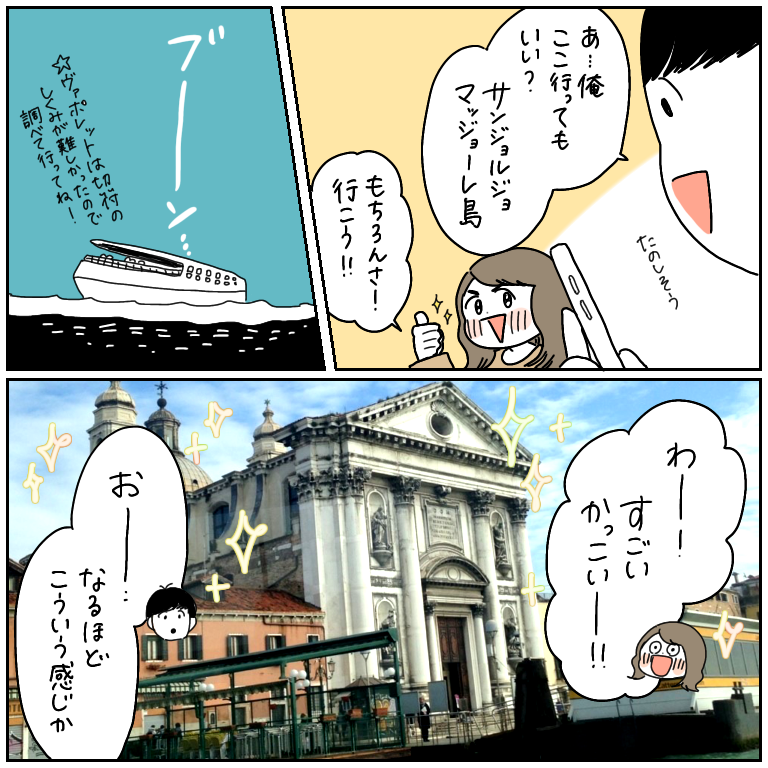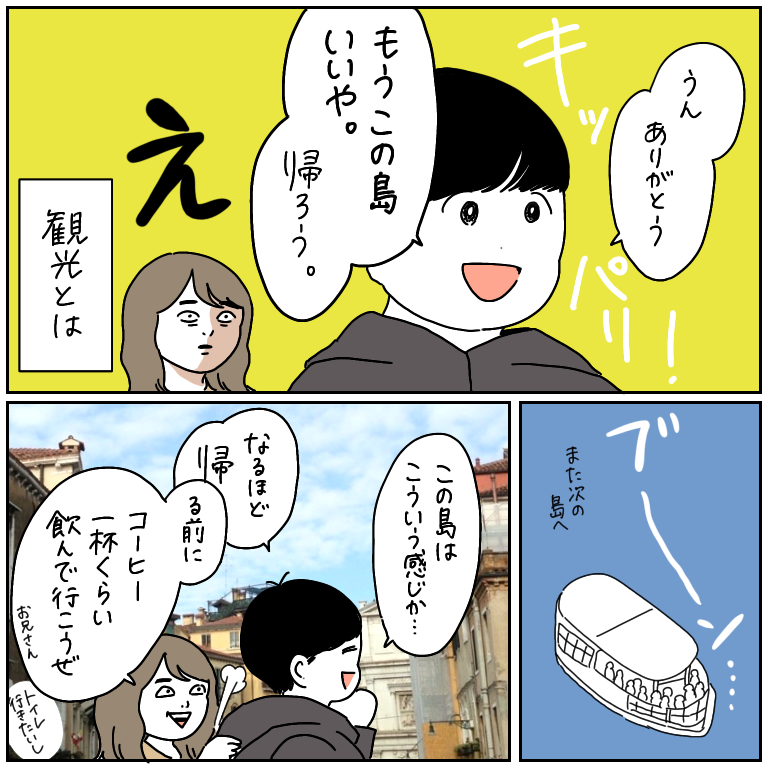 多彩だネ!!ボッタクリ☆【ヨーロッパ旅行記28】 ヨーロッパ旅行記、第28話です!前回の話はこちらから↓ 最初から読む方はこちらから↓(財布が)燃え尽きだぜ…真っ白にな…節約のためにあんなに全力を尽くしていたというのに、詐欺にも合わない警戒心を身につけたというのに、まさかトイレの利用で約1000円を失うとはね… ... 2021/10/04 ヨーロッパ旅行記、第28話です!前回の話はこちらから↓ 最初から読む方はこちらから↓(財布が)燃え尽きだぜ…真っ白にな…節約のためにあんなに全力を尽くしていたというのに、詐欺にも合わない警戒心を身につけたというのに、まさかトイレの利用で約1000円を失うとはね…☆しかしこれは免れない…必要出費さ…ちなみにイタリアに限らずヨーロッパでは、ほとんどの公共トイレが有料でした!大体50セント〜1ユーロあたりが相場ですかね。トイレ前に人がいて、その人に渡すスタイルもあれば、改札のようになっていて1ユーロ投入すると自動で開くスタイルもありました。お店のトイレは基本無料だったんですが…こんなパターンもあるんだなと、勉強になりました☆ちなみにちなみに、漫画にコーヒーの写真載っけてますが、トイレ課金が必要だった店とは違う店のコーヒーです!その店の写真は撮ってなかった…おまけタロスケが行きたがったサンジョルジョマッジョーレ島にて。何もせず帰るのはあまりに切なかったので、写真を撮りました。ベネチアの島めぐりはとっっても可愛い光景にたくさん出会えるので、おすすめです!個人的一位はムラーノ島!おもちゃの島みたいで本当に可愛かった!続きます! こちらのリンクから読者登録ができます↓ブログが公開されたらLINEでお知らせが届きます。ぜひ登録してくださるとうれしいです!