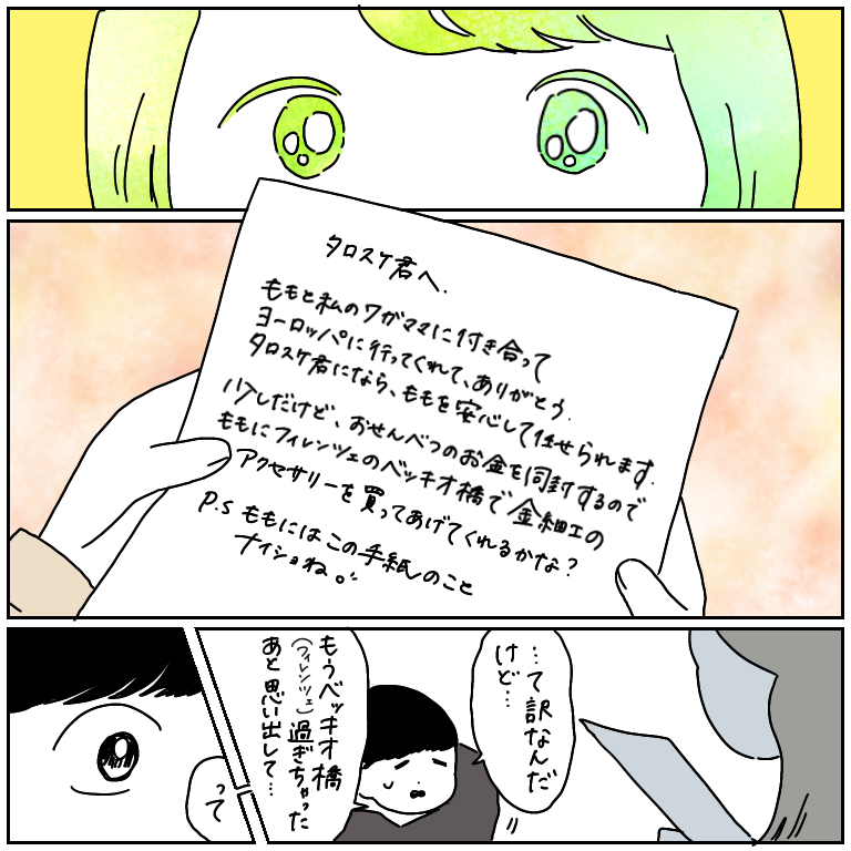 遠い地の母を思って【ヨーロッパ旅行記29】 ヨーロッパ旅行記、第29話です!前回の話はこちらから↓ 最初から読む方はこちらから↓当時の嗜好アクセサリー<<<<<<<<肉ちなみに肉は、旅の終着点、フランスで最終日にいただきましたー…!美味しかったです、お母さん、ありがとう!「お金ないから餞別は無しね」な ... 2021/10/09 ヨーロッパ旅行記、第29話です!前回の話はこちらから↓ 最初から読む方はこちらから↓当時の嗜好アクセサリー<<<<<<<<肉ちなみに肉は、旅の終着点、フランスで最終日にいただきましたー…!美味しかったです、お母さん、ありがとう!「お金ないから餞別は無しね」なんて言ってたのに、タロスケにこっそり渡してたなんてね…お母さんのツンデレな優しさが大好きだぞ!!!そんなお母さんの優しさに異国で触れ、つい泣いちゃったよね…(1週間で3回目)(泣きすぎ)タロスケは母の手紙を旅の前に読んでいたんだけど、なぜか手紙にある「ベッキオ橋」をベネチアだと勘違いしちゃったらしく、ベネチアに着いてからベッキオ橋の場所を調べてはじめて、「やべえベッキオ橋、フィレンツェやん!!!フィレンツェもう過ぎとるやん!!!😱」と…一人で焦り散らしていたようです。(カワイイ)親も彼氏も優しくて、お前、幸せ者だな!続きはこちらから! こちらのリンクから読者登録ができます↓ブログが公開されたらLINEでお知らせが届きます。ぜひ登録してくださるとうれしいです!