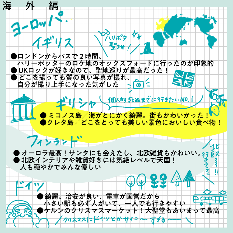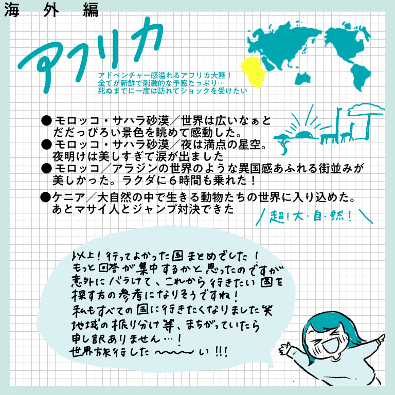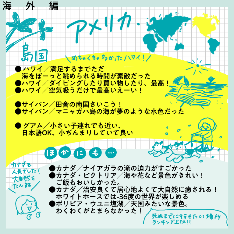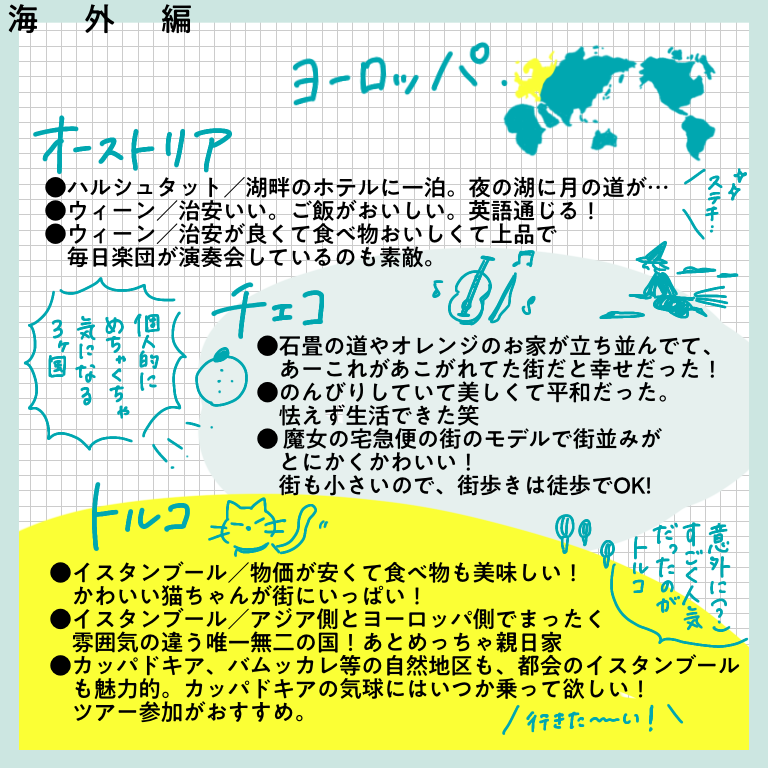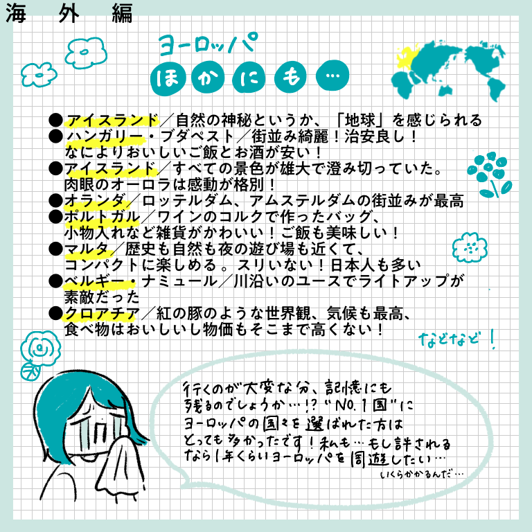 行ってよかったベスト1ー海外編ー【おしえてフォロワーさん】 皆さんこんにちはー!先日、インスタグラムにてヨーロッパ旅行記完結と共に行った旅に関するアンケートを行った際は、たっっっくさんのご回答をいただきありがとうございました!!正直20−30件くらいの回答数を予想していたので、あまりの多さに驚きと喜びでぴょんぴょんし ... 2022/02/19 皆さんこんにちはー!先日、インスタグラムにてヨーロッパ旅行記完結と共に行った旅に関するアンケートを行った際は、たっっっくさんのご回答をいただきありがとうございました!!正直20−30件くらいの回答数を予想していたので、あまりの多さに驚きと喜びでぴょんぴょんしてました。本来はその全てを生かせるようなまとめにしたかったのですが、インスタに掲載できる枚数の都合上もあり、ご回答を全て掲載することができず…!お答えいただいたのに、載ってない!という方…申し訳ありません…!みなさまの回答ひとつひとつ、ワタクシはひとつ残らずじっくり見させていただきました…!とは言え回答をたくさん載せたい気持ちが強く、結構文字だらけのまとめになってしまいました。😂少し見づらい部分もあるかと思いますが、みなさまの経験がぎッッっっっしり詰まった価値のある情報になっていると思いますので、どうか海外に行けるその日のためのご参考になさってくださいね!今回は「今まで行った国の中で満足度が高かった国ー海外編」です!どうぞーっ!…いかがでしたでしょうか?!文字が小さかったですかね・・・!?もし小さくて読めない!!と思ったら、お手数ですが画面をスクショして拡大して読んでいただけると嬉しいです…(本当にお手数…)個人的には、ヨーロッパの中でトルコ、チェコが人気ランキング上位入りしているのが意外でした!あまり観光地としては知名度ないのかな?と勝手に思っていたのですが、人気なのですね…!あと北欧に行かれている方がたくさんいらっしゃること!!!遠いのに…すごい…!いいなああああ私もいつか絶対に行きたい場所です、北欧😭かもめ食堂見ながら闘志をたぎらせています(そんな気持ちでかもめ食堂見るやつがあるかというわけで私個人としてもいろんな発見や驚きがあり、とても楽しかったです✨次回は国内旅行編!どうぞお楽しみにー!こちらのリンクから読者登録ができます↓ブログが公開されたらLINEでお知らせが届きます。ぜひ登録してくださるとうれしいです!