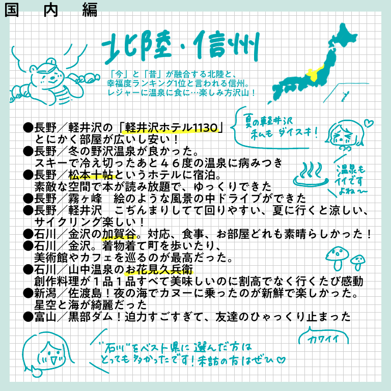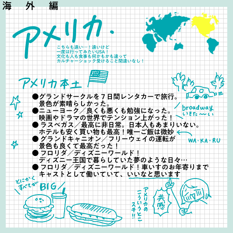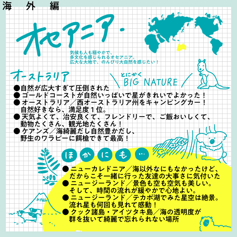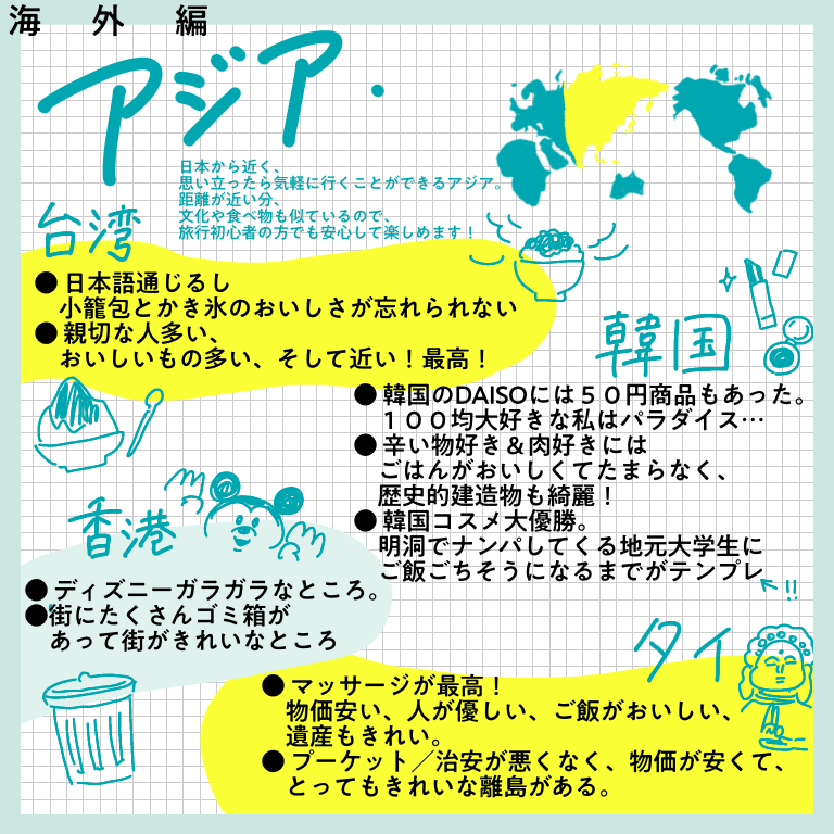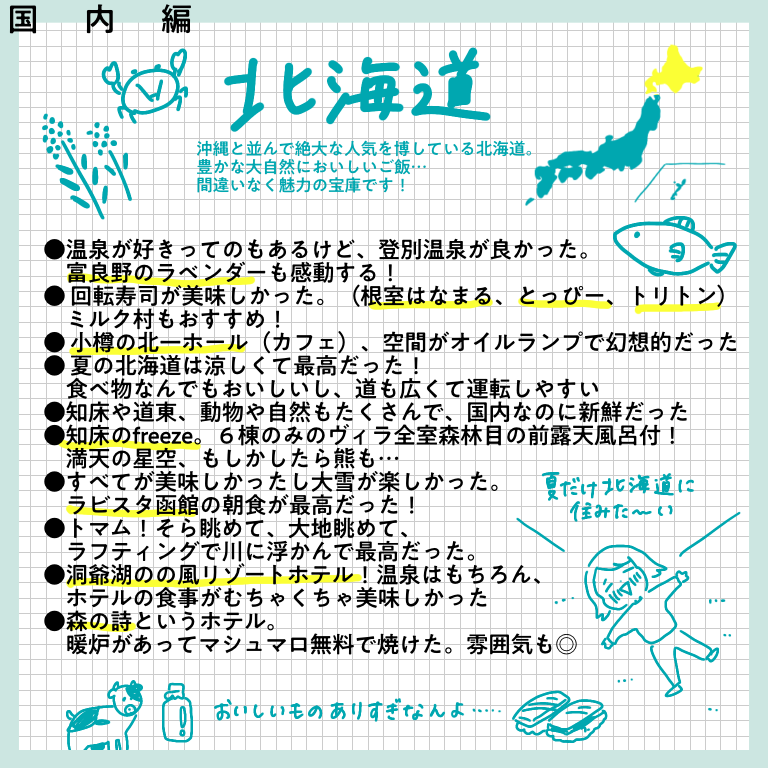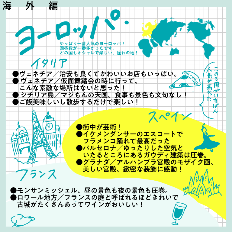 行ってよかったベスト1ー海外編ー【おしえてフォロワーさん】 皆さんこんにちはー!先日、インスタグラムにてヨーロッパ旅行記完結と共に行った旅に関するアンケートを行った際は、たっっっくさんのご回答をいただきありがとうございました!!正直20−30件くらいの回答数を予想していたので、あまりの多さに驚きと喜びでぴょんぴょんし ... 2022/02/19 皆さんこんにちはー!先日、インスタグラムにてヨーロッパ旅行記完結と共に行った旅に関するアンケートを行った際は、たっっっくさんのご回答をいただきありがとうございました!!正直20−30件くらいの回答数を予想していたので、あまりの多さに驚きと喜びでぴょんぴょんしてました。本来はその全てを生かせるようなまとめにしたかったのですが、インスタに掲載できる枚数の都合上もあり、ご回答を全て掲載することができず…!お答えいただいたのに、載ってない!という方…申し訳ありません…!みなさまの回答ひとつひとつ、ワタクシはひとつ残らずじっくり見させていただきました…!とは言え回答をたくさん載せたい気持ちが強く、結構文字だらけのまとめになってしまいました。😂少し見づらい部分もあるかと思いますが、みなさまの経験がぎッッっっっしり詰まった価値のある情報になっていると思いますので、どうか海外に行けるその日のためのご参考になさってくださいね!今回は「今まで行った国の中で満足度が高かった国ー海外編」です!どうぞーっ!…いかがでしたでしょうか?!文字が小さかったですかね・・・!?もし小さくて読めない!!と思ったら、お手数ですが画面をスクショして拡大して読んでいただけると嬉しいです…(本当にお手数…)個人的には、ヨーロッパの中でトルコ、チェコが人気ランキング上位入りしているのが意外でした!あまり観光地としては知名度ないのかな?と勝手に思っていたのですが、人気なのですね…!あと北欧に行かれている方がたくさんいらっしゃること!!!遠いのに…すごい…!いいなああああ私もいつか絶対に行きたい場所です、北欧😭かもめ食堂見ながら闘志をたぎらせています(そんな気持ちでかもめ食堂見るやつがあるかというわけで私個人としてもいろんな発見や驚きがあり、とても楽しかったです✨次回は国内旅行編!どうぞお楽しみにー!こちらのリンクから読者登録ができます↓ブログが公開されたらLINEでお知らせが届きます。ぜひ登録してくださるとうれしいです!