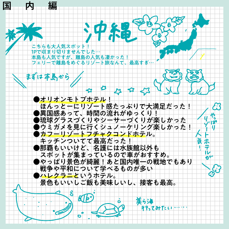 行ってよかったベスト1ー国内編ー【おしえてフォロワーさん】 みなさんこんにちはー!前回の記事で予告した通り、今回はインスタでフォロワーさんに聞いた「今まで旅した中で満足度の高かった場所ー国内編」をまとめていきたいと思いますー!早速、どうぞー!!! はいー!またまた文字でパンパンになってしまいました…あはは…でもこ ... 2022/02/23 みなさんこんにちはー!前回の記事で予告した通り、今回はインスタでフォロワーさんに聞いた「今まで旅した中で満足度の高かった場所ー国内編」をまとめていきたいと思いますー!早速、どうぞー!!! はいー!またまた文字でパンパンになってしまいました…あはは…でもこれも、とってもいい情報が詰まってると思う!!フォロワーさん本当にありがとうございます😭😭😭😭私個人的に「行ってよかったベスト旅先」は うーーーん… 迷うけど…直島→豊島→小豆島の瀬戸内の島国を巡った旅が、すごくよかったなあーー直島は島全体がアートでどこを歩いても楽しいし古民家カフェが可愛いし、豊島はとにかくのどか!!!あと豊島美術館がすっごく不思議な空間で面白かった。そして小豆島のオリーブの丘って場所がとッッっっても可愛くてなあ…ああーーーーーーまた行きたくなってきた!!!!!😭夏は島国に行きたくなる病にかかっておりますあと好きなホテルで言うと・アンダピング(静岡/伊豆) アクティビティが豊富で時間が足りないほど楽しいホテル! 2食+夜食付きで、一人3万くらい〜。・NIPPONIA串本(和歌山/串本) 贅沢の限りを味わえる究極の癒し空間… ご飯がとにかく美味しすぎました 2食付きで、一人5万くらい〜。・アンワインド(北海道/小樽) 建物も部屋もご飯もめっっちゃおしゃれだった!! 朝食がアフターヌーンティーみたいですっごい楽しかった… 朝食付きで一人5000円くらい〜。(やっす!!)このあたりがすごく良かったですかね!泊まったホテルレビューとかもやりたいなあ…国内も落ち着いたら色々旅行したいですね…その時の参考に少しでもなれば嬉しいです!次回は、みなさまの旅先でのやっちまった!まとめです!どうぞお楽しみに!!!こちらのリンクから読者登録ができます↓ブログが公開されたらLINEでお知らせが届きます。ぜひ登録してくださるとうれしいです!