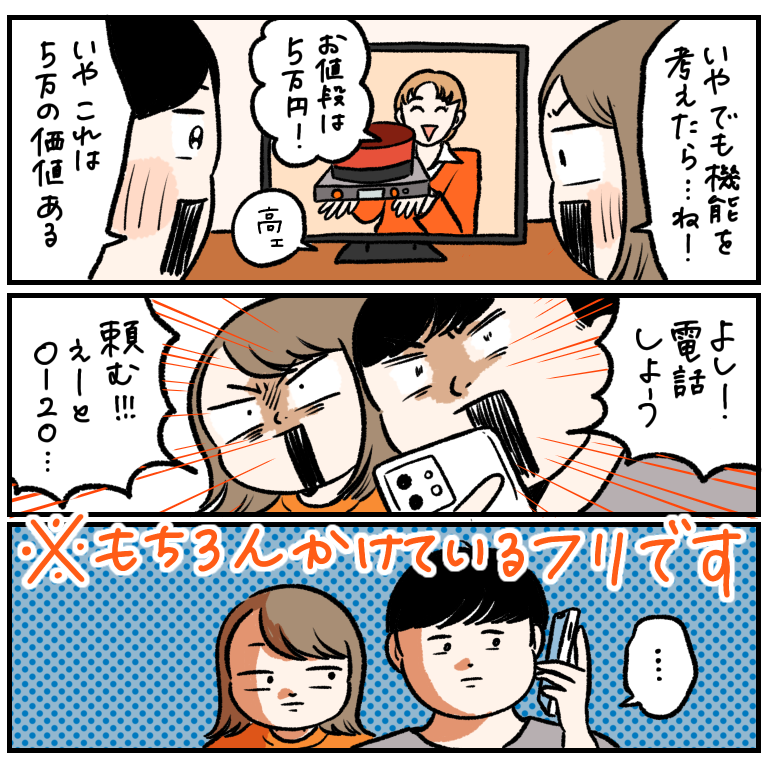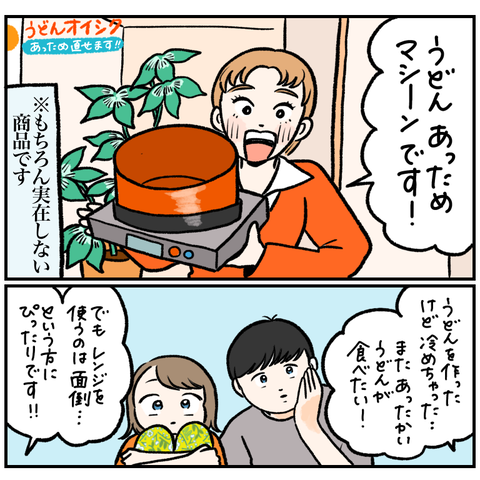 みんなも買おう!うどんあっためマシーン!! こういうやりとり永遠にやって生きていきたい。深夜のテレビショッピング、 たまーに見るんですけど、「この商品何に使うん…?!」ってやつありません??流石にうどんあっためマシーンはないですけど(当たり前だ)アピールポイントも、「そこ?!!」っていう、ツッコミた ... 2024/06/02 こういうやりとり永遠にやって生きていきたい。深夜のテレビショッピング、 たまーに見るんですけど、「この商品何に使うん…?!」ってやつありません??流石にうどんあっためマシーンはないですけど(当たり前だ)アピールポイントも、「そこ?!!」っていう、ツッコミたくなるものあったりして誰かと見ると楽しいかもしれません。※責任は負いかねます逆に、「これ結構いいな…マジで買っちゃおうかな」ってやつもあります。この間掃除機の紹介してて、すげぇ…でも5万とかするんだろ絶対…って話してたらなんと驚きの2万円!!しかも今なら15000円!!とか言い出して「マジで買う…?」ってなりました。結局迷いに迷って買わなかったけど、ずっと気になってる…。