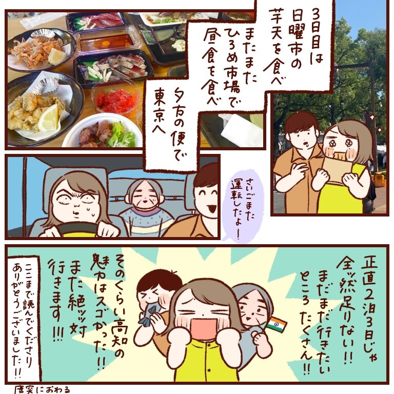 【高知旅行⑩】ありがとう高知!【完】 急に終わりました!!!笑3日目はねー、特に何も起こらなかったんですよね!笑日曜市を楽しんで、芋天食べて帰りました。(昼の便だったので割とバタバタだった)はい…ここまで楽しんでいただいて、ありがとうございました!いつか行きたいと思っていた高知、いいところ ... 2024/12/04 急に終わりました!!!笑3日目はねー、特に何も起こらなかったんですよね!笑日曜市を楽しんで、芋天食べて帰りました。(昼の便だったので割とバタバタだった)はい…ここまで楽しんでいただいて、ありがとうございました!いつか行きたいと思っていた高知、いいところなんだろうなぁ〜とバキバキにハードルを上げて臨んだにも関わらず、そのハードルを優に超える、素晴らしい場所でした。ご飯美味しい、景色きれい、人はあたたか!こんなにいい場所ありますか!!2泊3日と言わず70泊くらいしたいたくなっちゃうような…そんな場所でした。おすすめのご飯どころ(この明神丸を教えてくれた方も!)を教えてくださったり、あたたかく迎えてくださった高知県民のフォロワーさんなど、たくさんの方に支えていただきました、ありがとうございます!また必ず高知に行きたい…その日を夢見てまた頑張れそうです。高知、最高!!!!!そしてやっぱり旅行が大好き!またいろんな場所を旅したいなあ。そしてまた漫画描きたい。旅して漫画描いて、2度楽しめる。なんて最高なんだ!!!というわけで、また旅漫画描いたら、ぜひ読んでくださったら嬉しいです☺️