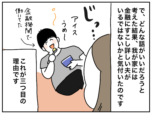 ド素人のわたしの立場から、元金融機関勤務の夫にインタビューする形で聞いてみて、