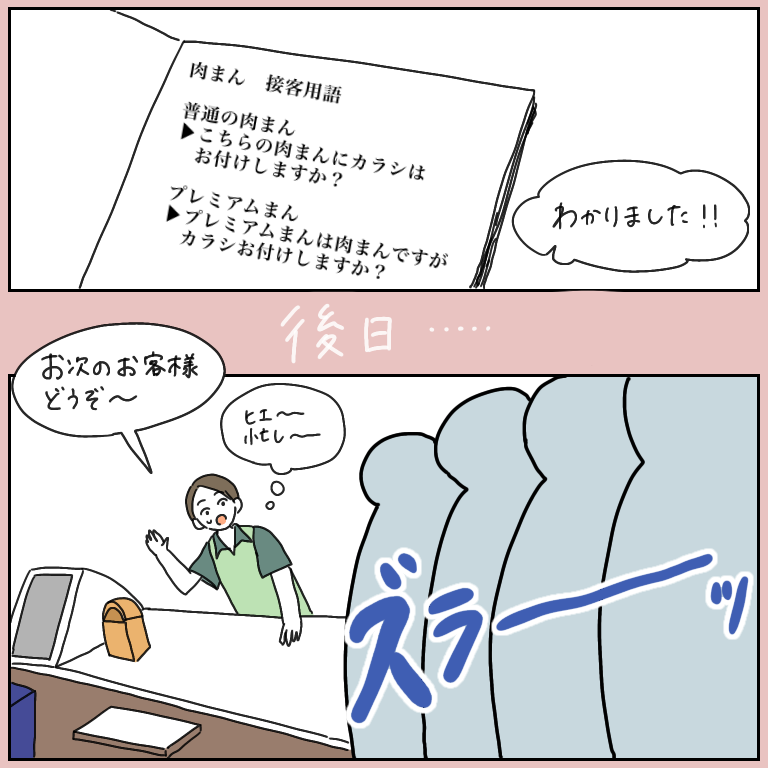 接客用語がゲシュタルト崩壊しちゃうこと、あるよね とりあえず肉まんだということはすごく伝わった…!マニュアルとか接客用語とかって、ずっと繰り返してるとなんか言語?というより音みたいになってきてふとしたときに自分で何言ってんのかわかんなくなるときありますよね。わたしはありました。だからすごく共感できる!! ... 2021/01/12 とりあえず肉まんだということはすごく伝わった…!マニュアルとか接客用語とかって、ずっと繰り返してるとなんか言語?というより音みたいになってきてふとしたときに自分で何言ってんのかわかんなくなるときありますよね。わたしはありました。だからすごく共感できる!!このミス!!わたしもパン屋でバイトしてたとき、焼き立てのパンを並べる際に「〇〇が焼きあがりましたー。いかがでしょうかー。どうぞご利用くださいませー」っていうマニュアルがあったんですが、ぼーっとしすぎてて「いかがでしょうかー。どうぞいかがでくださいませー。」って言ってたことがあるらしいです。らしいというのは、自分でも意識が飛びすぎてて、バイト仲間から指摘されてはじめて知ったからです。いかがでくださいませ。こちらはフォロワーさんから募集したネタの漫画化です。ネタのご提供、ありがとうございました!こちらのリンクから読者登録ができます↓ブログが公開されたらLINEでお知らせが届きます。ぜひ登録してくださるとうれしいです!