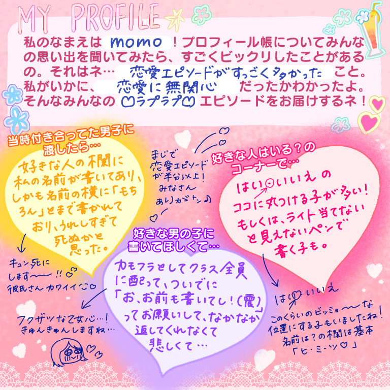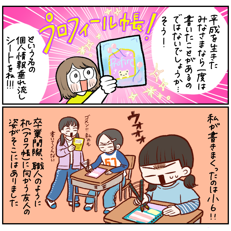 名前はもちろん、学校名、出席番号、部活、血液型、テストの点数、母の名前、…どこまで開示すれば気がすむねん!てレベルでありとあらゆる個人情報を書きまくってました。